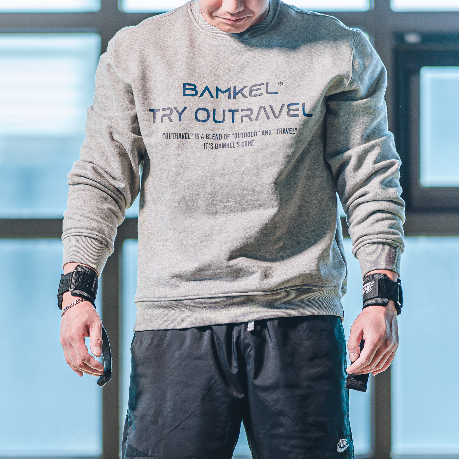 밤켈 아웃트래블 맨투맨그레이 100 / 모델 사이즈 177cm, 83kg